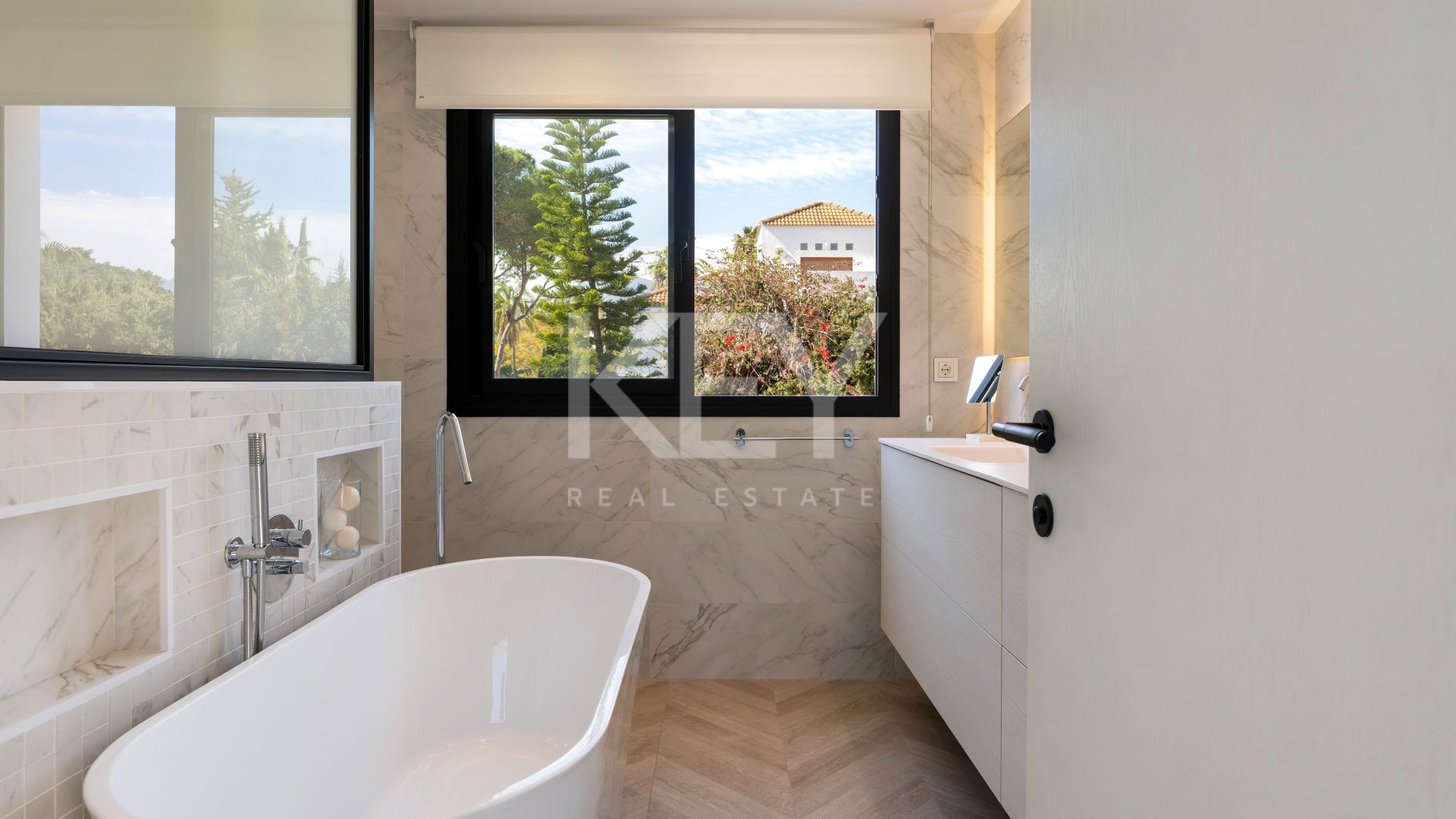 The villa has been carefully redesigned to meet current trends in luxury real estate, combining contemporary architecture with natural materials and clean finishes. Set on a mature landscaped plot, it provides a private and peaceful environment. Large windows and open-plan interiors maximise natural light, creating bright living spaces that connect seamlessly with the outdoor areas, a feature frequently sought in Marbella property searches.