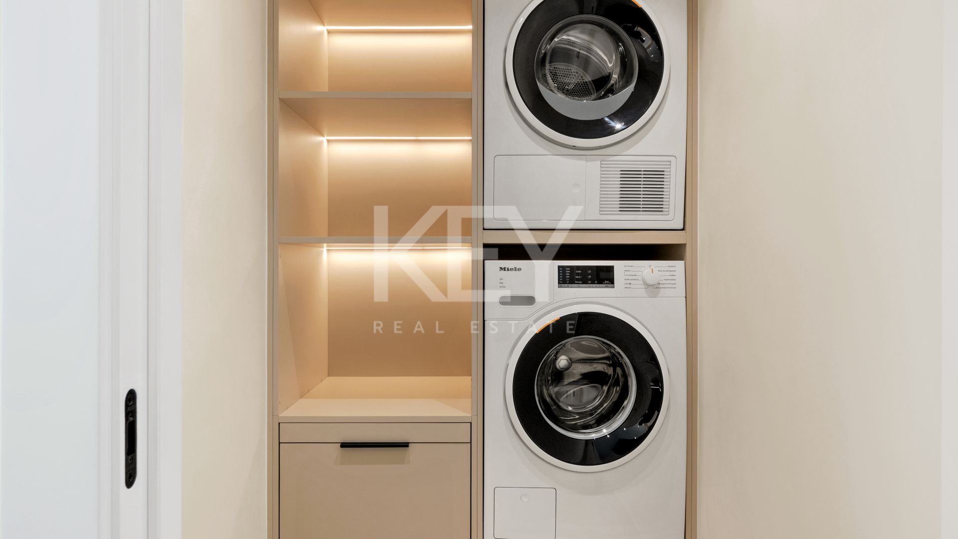 Inside, the apartment has been designed with both functionality and aesthetics in mind. The kitchen includes high-quality German appliances, an integrated Thermomix, and an innovative invisible cooking surface, aligning with current trends in “modern kitchen design luxury apartments.” Each of the three bedrooms is spacious, featuring elegant finishes, while the bathrooms are fitted with contemporary fixtures. Additional features such as a walk-in wardrobe, underfloor heating, wine cabinet, and a dedicated laundry room enhance everyday living. A separate office space with glass enclosures provides a quiet and bright area for remote work, increasingly important for buyers searching “homes with office Costa del Sol.”