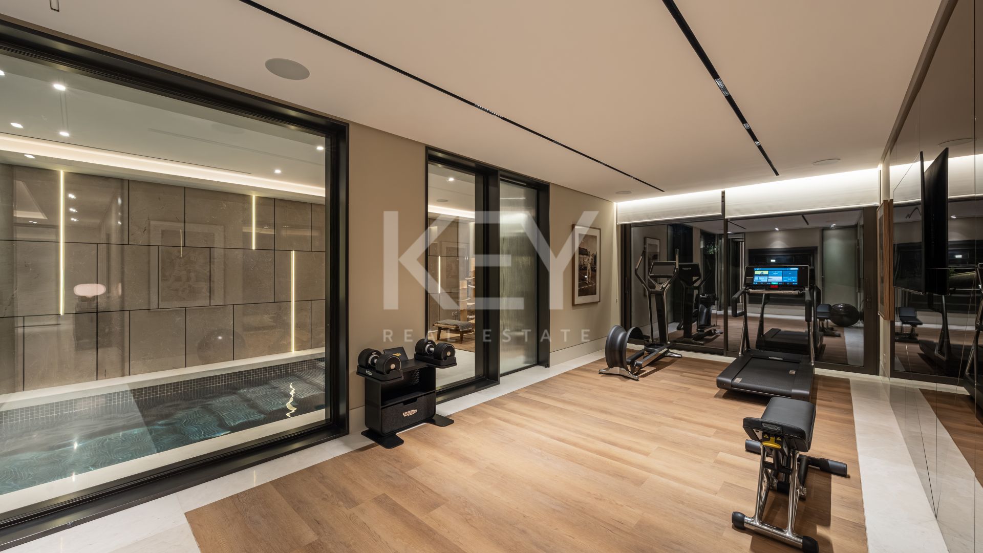 This Marbella villa also includes premium lifestyle features such as a private gym, indoor pool, Turkish bath and a dedicated entertainment area with a bar, creating a complete wellness and leisure experience within the property. The outdoor spaces are equally well designed, with a private swimming pool, several seating areas and a solarium with an outdoor kitchen, ideal for enjoying the Mediterranean climate and sea views.