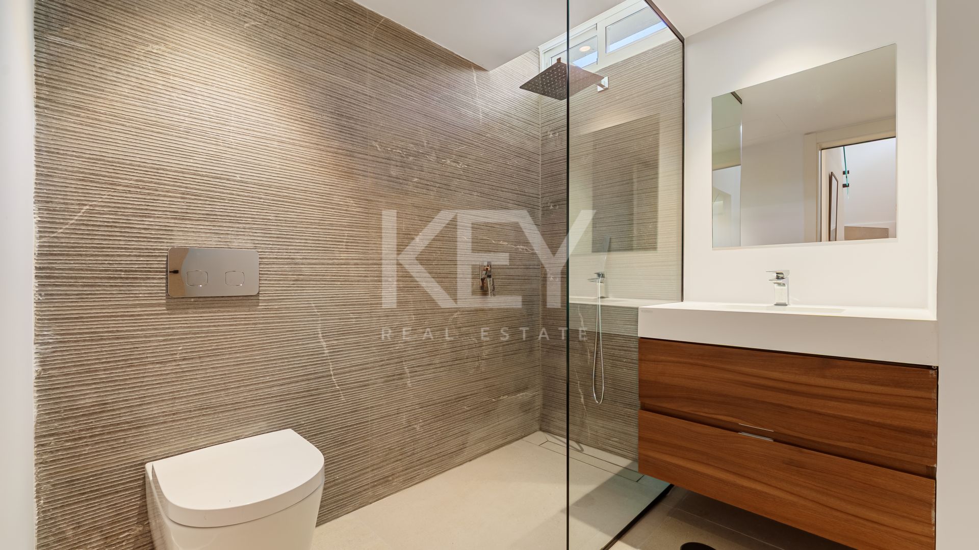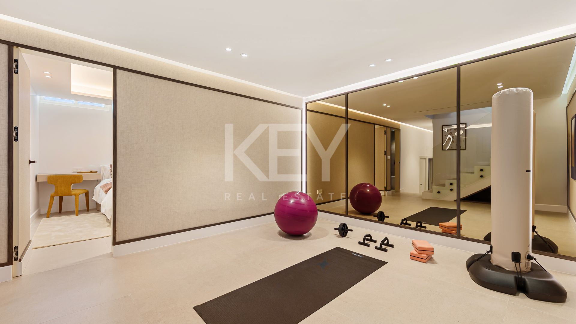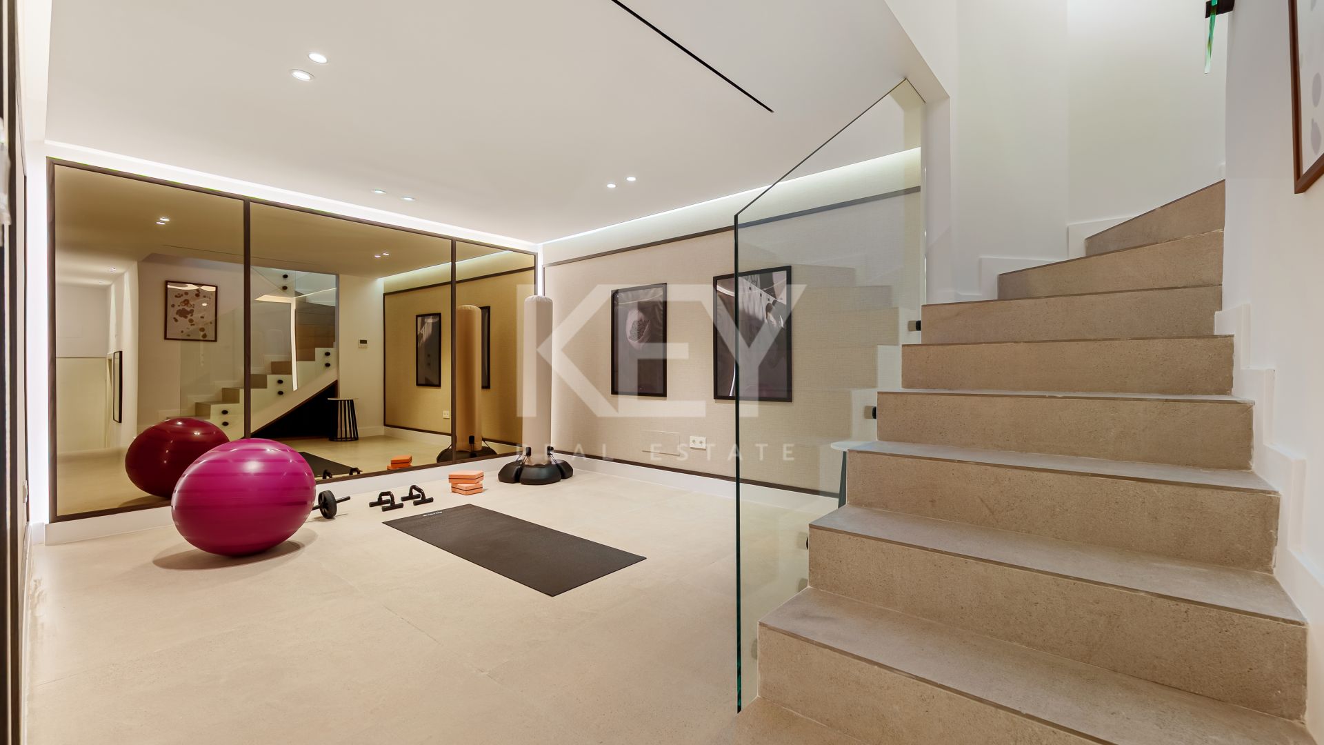 The property includes four spacious bedrooms, all with built-in wardrobes and a consistent interior design. The main bedroom stands out with its private terrace and en-suite bathroom, finished with distinctive materials that add character without overwhelming the space. On the lower level, the home offers additional lifestyle features including a private cinema room, a fully equipped gym, and direct access to a double garage, adding practicality and value to the property.