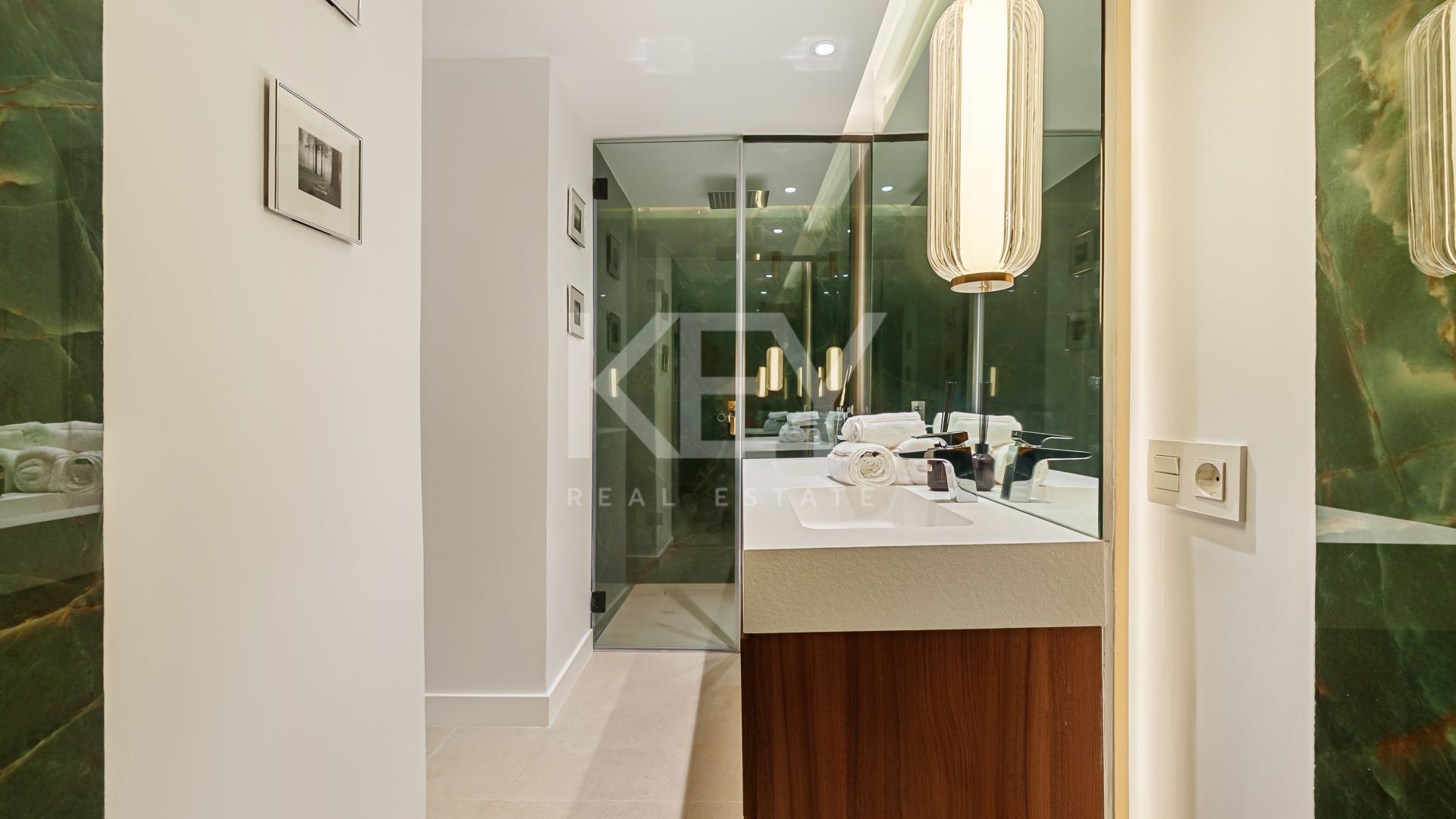 The main living area has been designed to maximise natural light and connection to the outdoors. Large floor-to-ceiling windows open onto a south-facing terrace and private garden, creating a seamless indoor-outdoor flow. The open-plan kitchen and bathrooms feature premium materials and a clean, modern aesthetic, ideal for buyers searching for a move-in-ready property in Marbella. The space is equally suited for relaxed family living or entertaining guests in a refined environment.