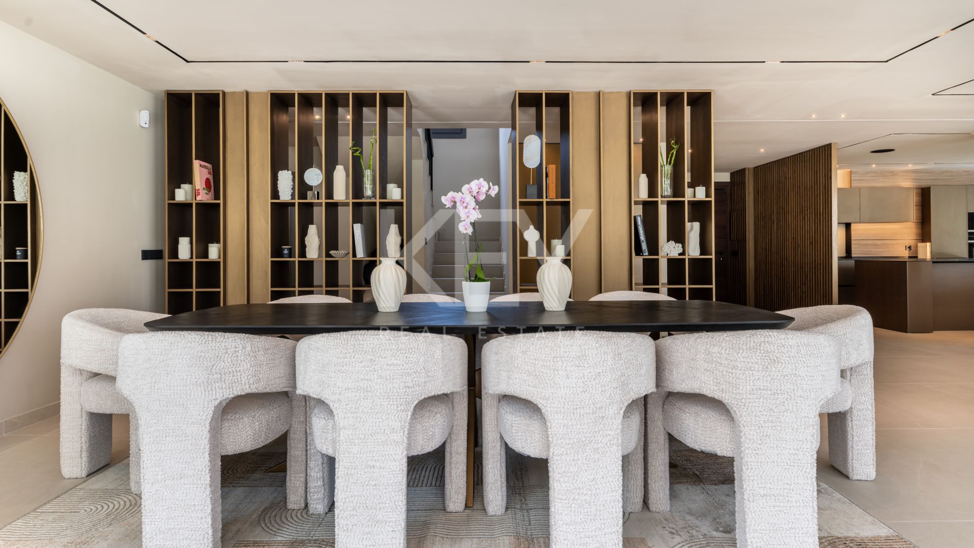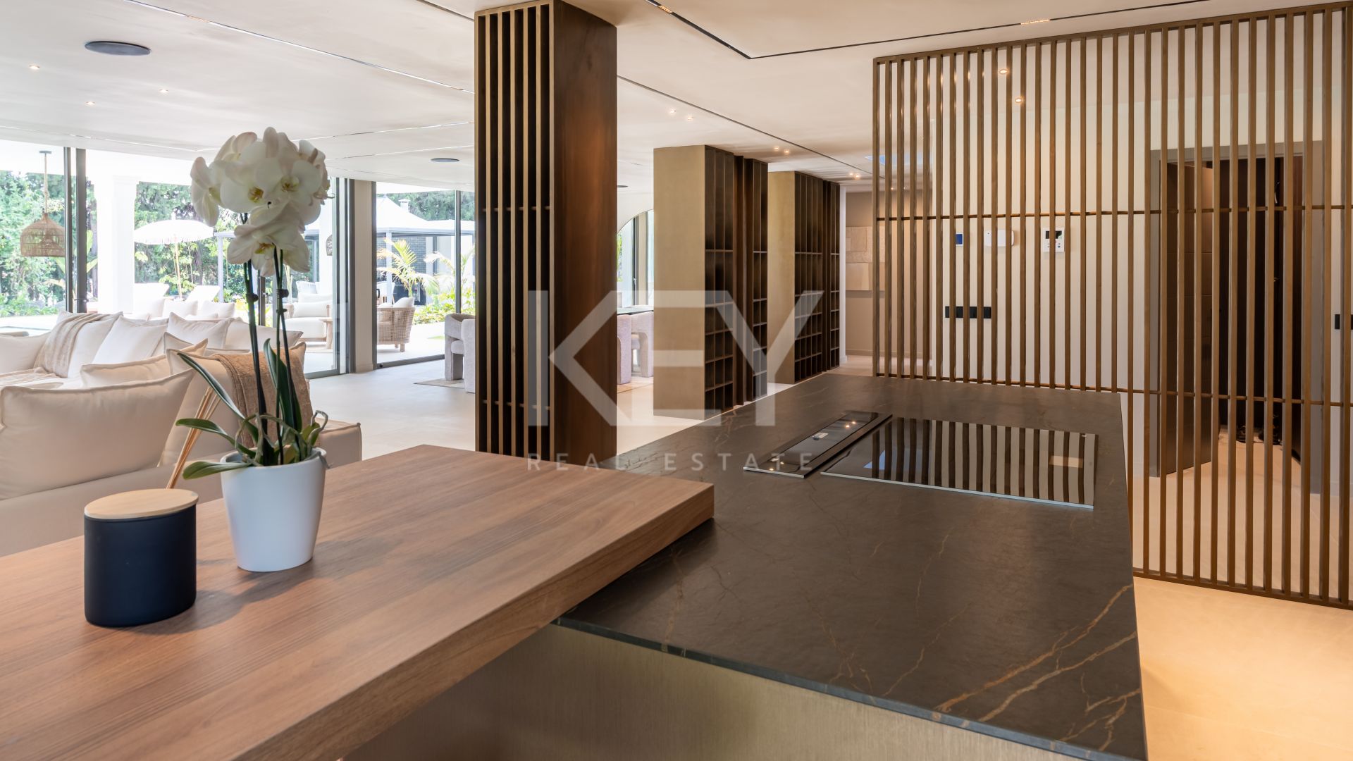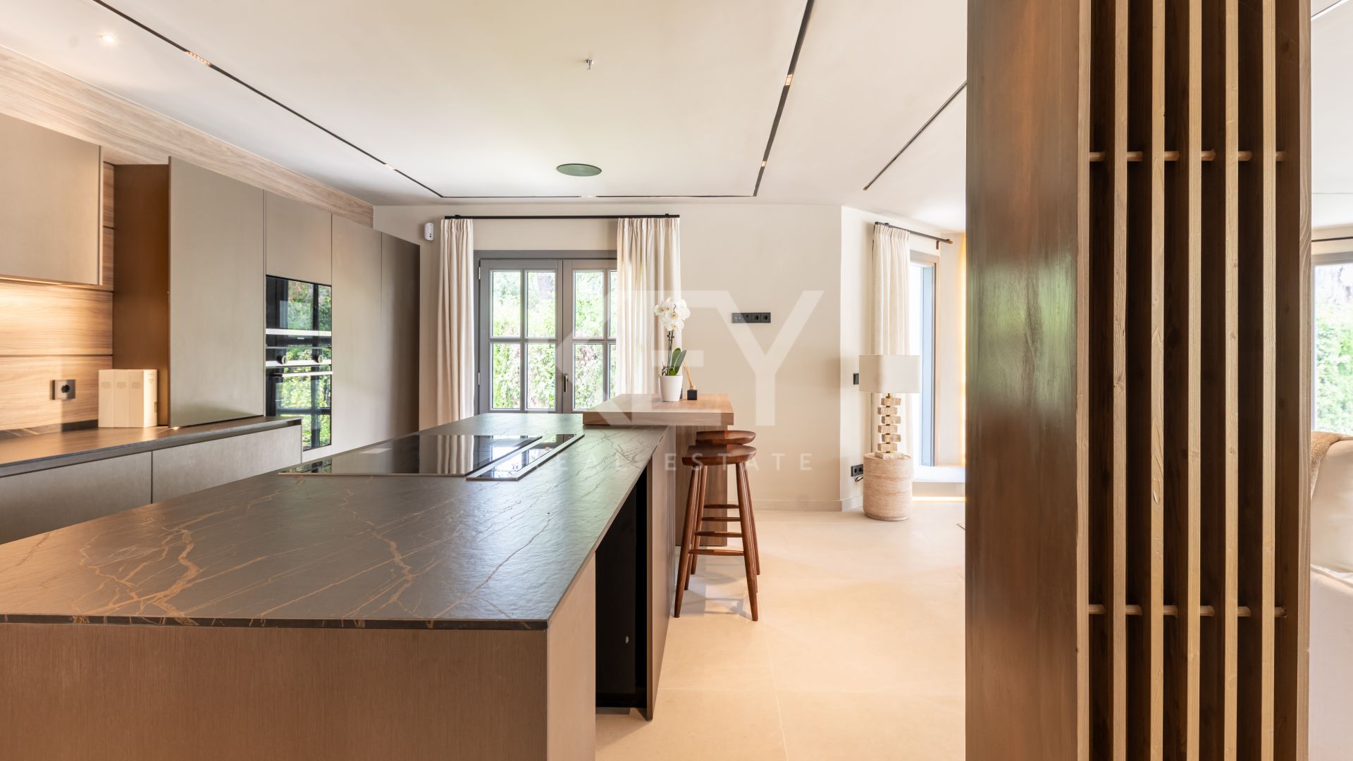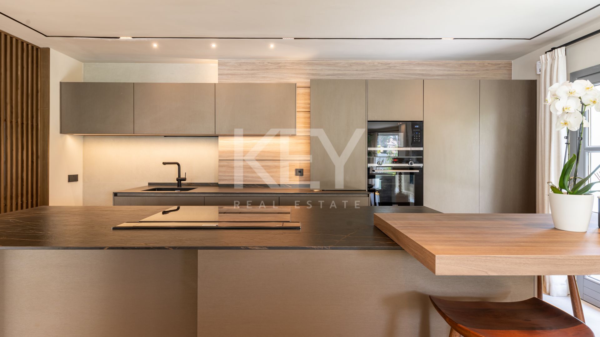 Внутри естественный свет наполняет открытые жилые помещения, где каждое пространство гармонично соединяется с террасами и садом. Обеденная зона с камином добавляет теплого, домашнего уюта, а современная кухня, оборудованная техникой Siemens, сочетает в себе функциональность и элегантный дизайн. Тонкие детали из натурального дерева и качественная отделка создают гостеприимную атмосферу, в которой утонченность сочетается с комфортом.
