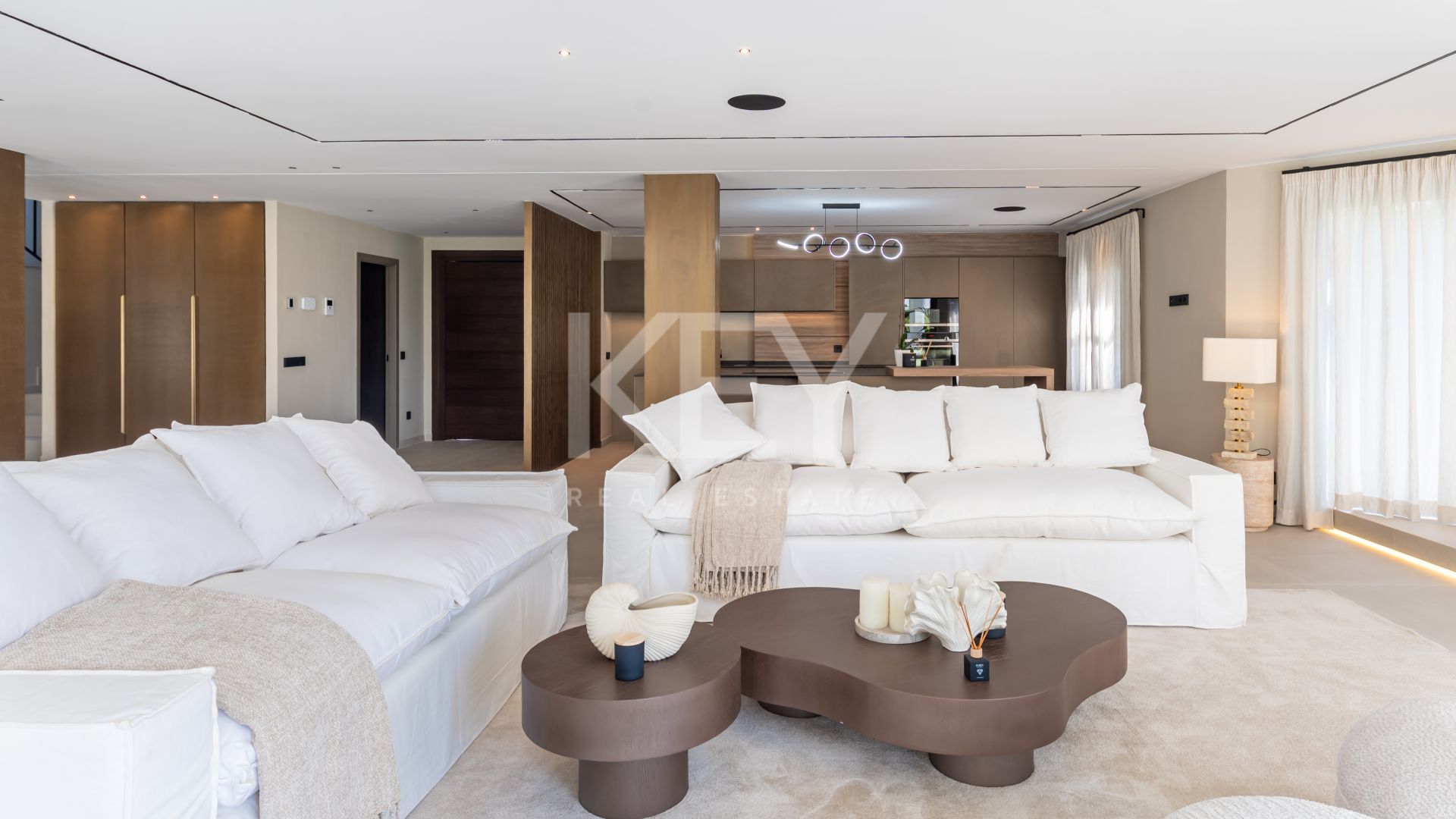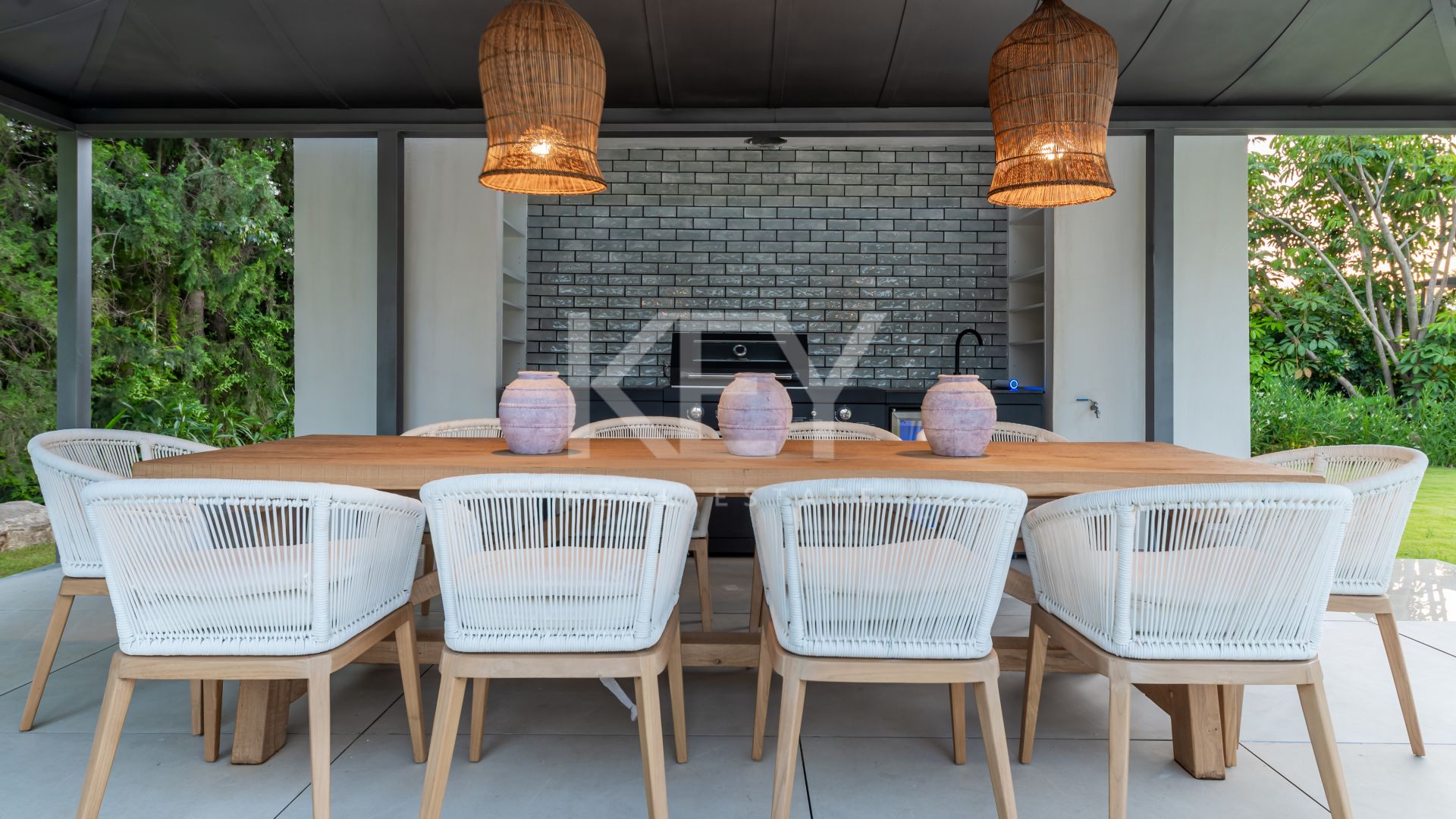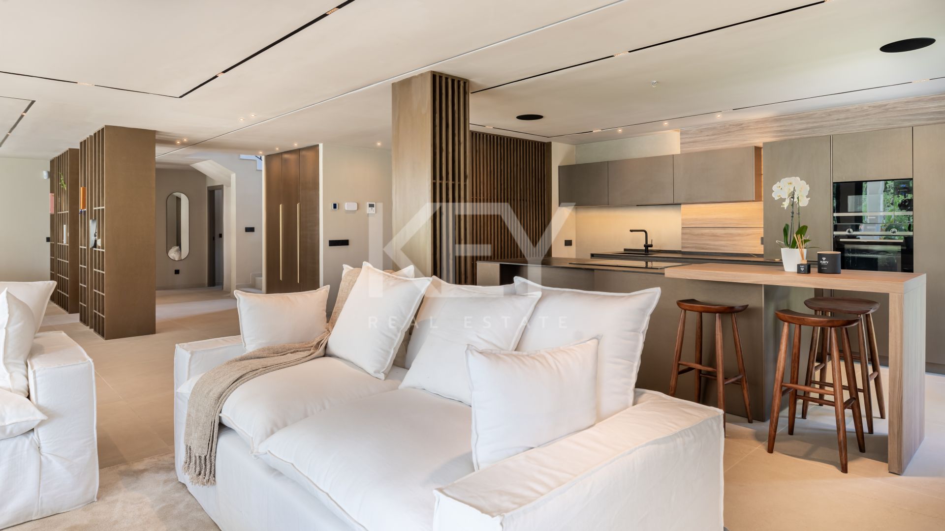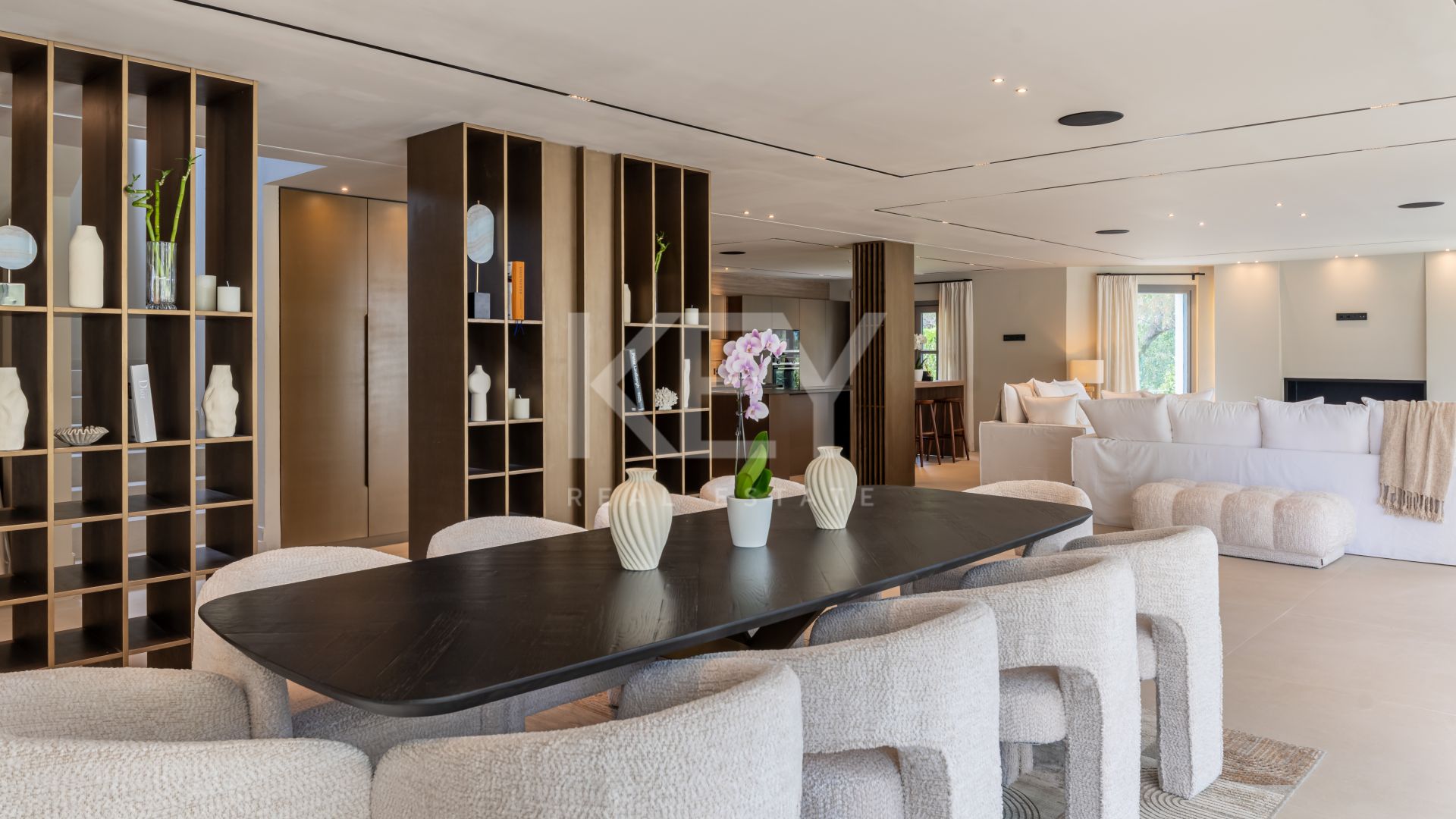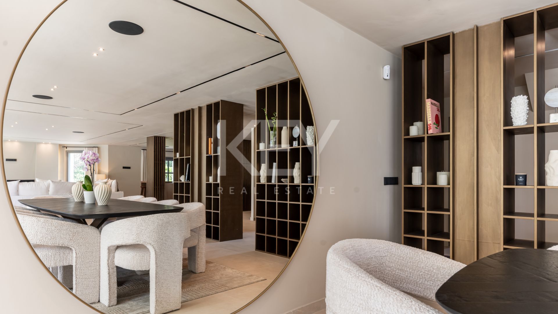 Внутри естественный свет наполняет открытые жилые помещения, где каждое пространство гармонично соединяется с террасами и садом. Обеденная зона с камином добавляет теплого, домашнего уюта, а современная кухня, оборудованная техникой Siemens, сочетает в себе функциональность и элегантный дизайн. Тонкие детали из натурального дерева и качественная отделка создают гостеприимную атмосферу, в которой утонченность сочетается с комфортом.