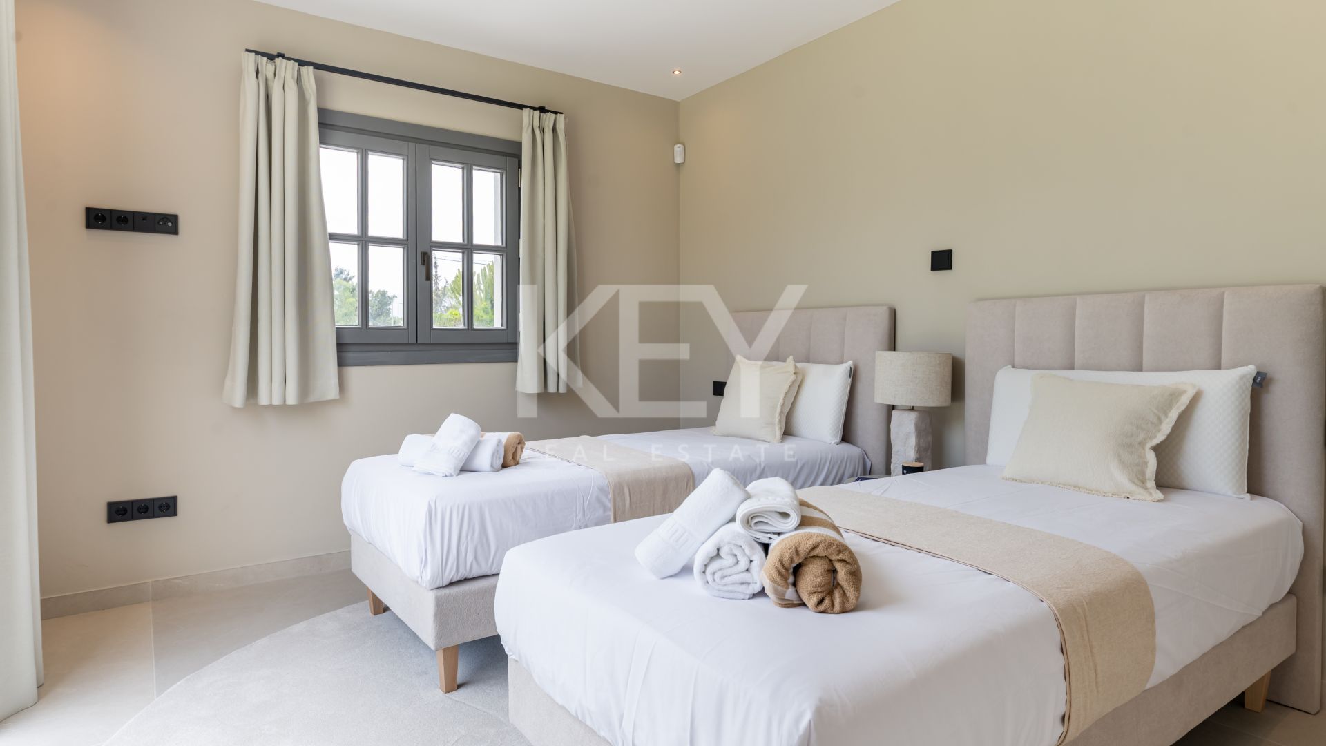 В доме есть две главные спальни, каждая с ванной комнатой в стиле спа и спокойным видом на сад, что обеспечивает уединение и спокойную атмосферу. Дополнительные помещения включают отдельные комнаты для гостей, прачечную и подсобное помещение, что обеспечивает удобство для повседневной жизни.