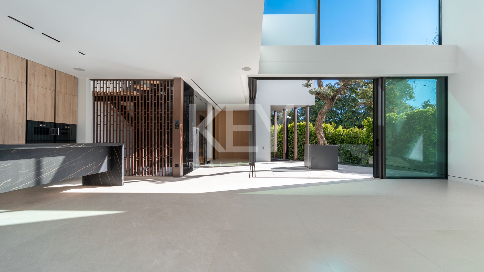 Вилла спроектирована на четырёх уровнях и сочетает современную архитектуру, продуманную планировку и высокий уровень строительства. Западная ориентация обеспечивает хорошее естественное освещение в течение всего дня. Панорамные окна от пола до потолка создают плавную связь между внутренним пространством и просторными террасами. С разных уровней открываются виды на Средиземное море, гору Ла Конча, ухоженные общие сады и бассейн закрытого комплекса.