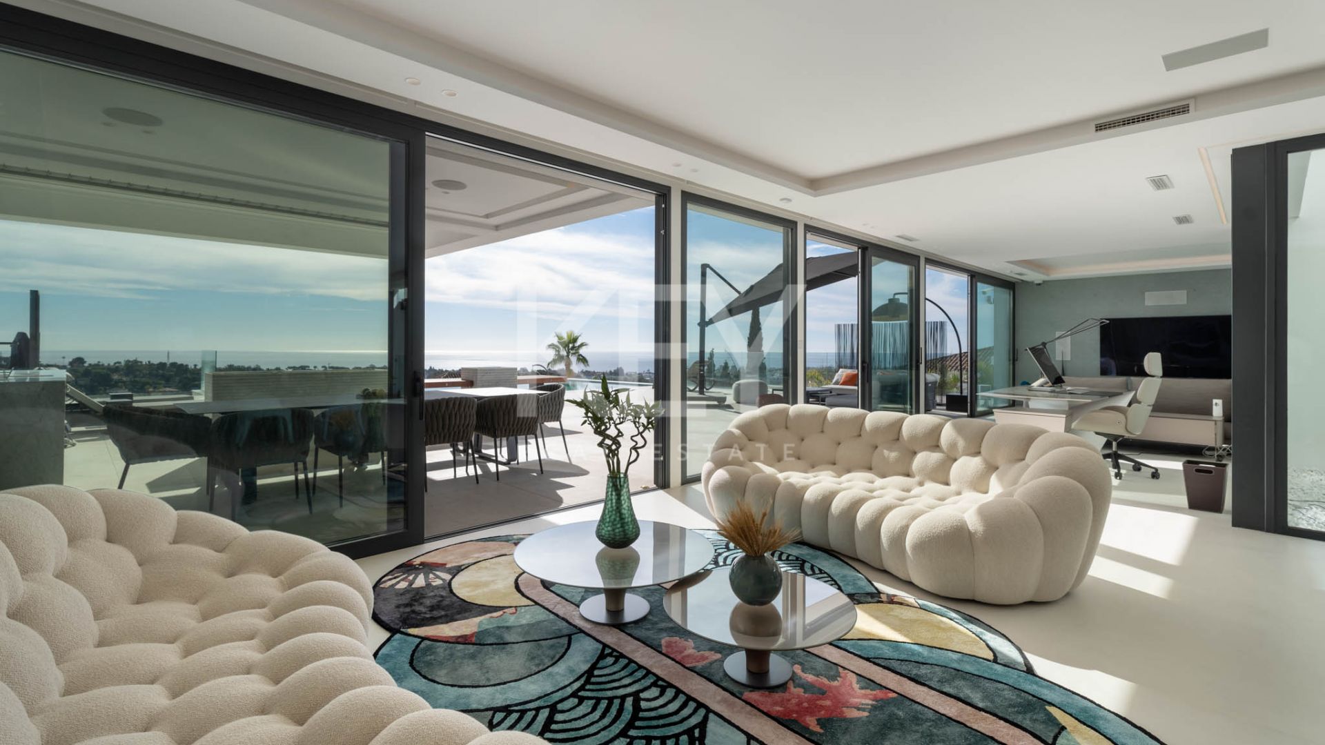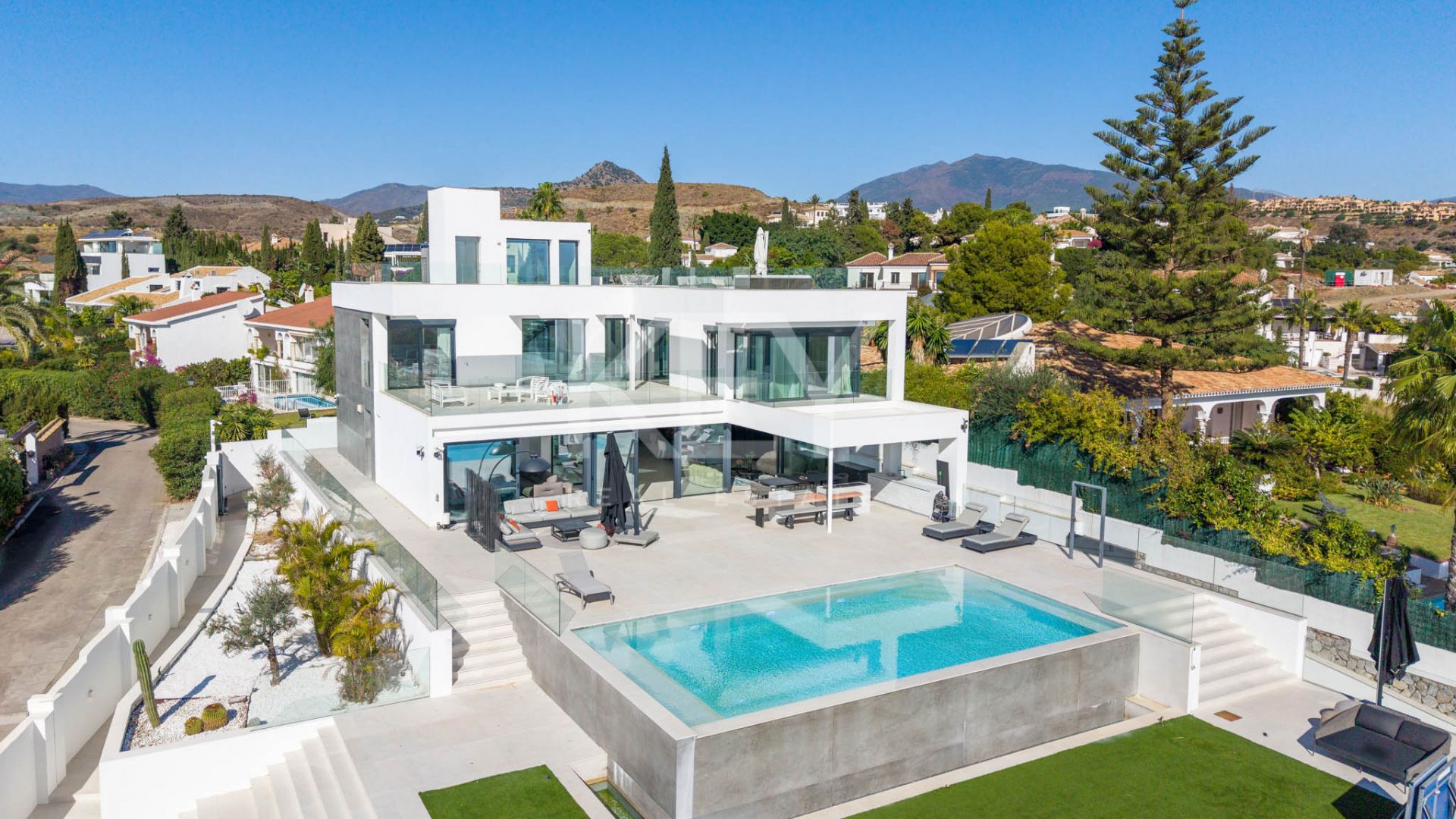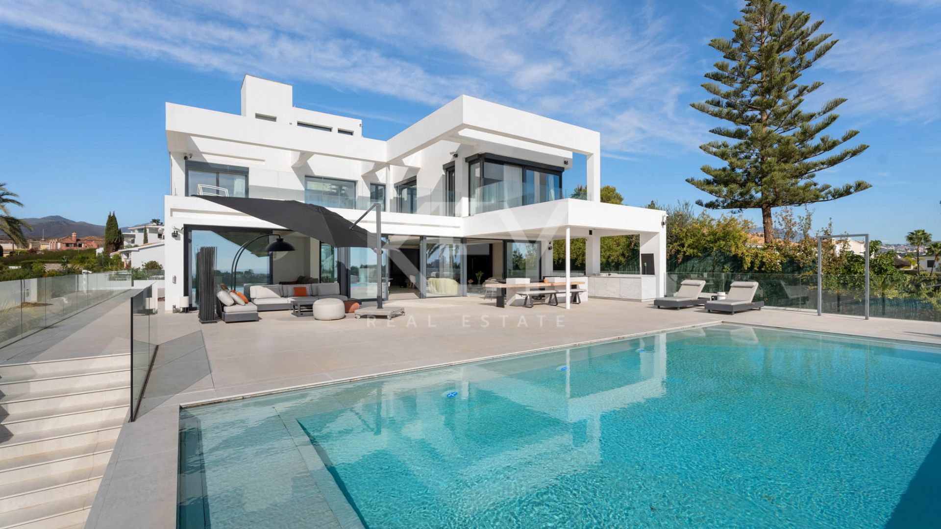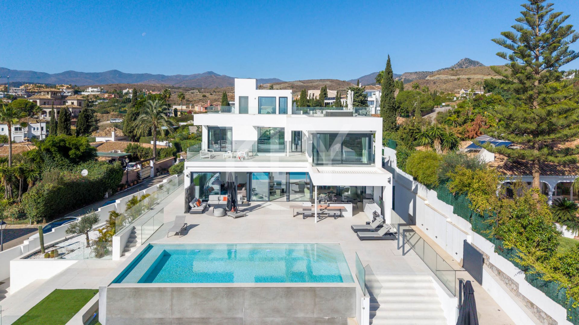 Современная дизайнерская вилла в районе Paraiso Alto представляет собой продуманную концепцию жилого пространства для тех, кто ценит простор, приватность и открытые виды в одном из самых устоявшихся районов Бенахависа. Расположенная на возвышенном участке над гольф-полем El Paraíso Golf, вилла предлагает панорамные виды на ухоженные фервеи, Средиземное море, Гибралтар, африканское побережье и гору Ла Конча, которыми можно наслаждаться из различных внутренних помещений и с террас.