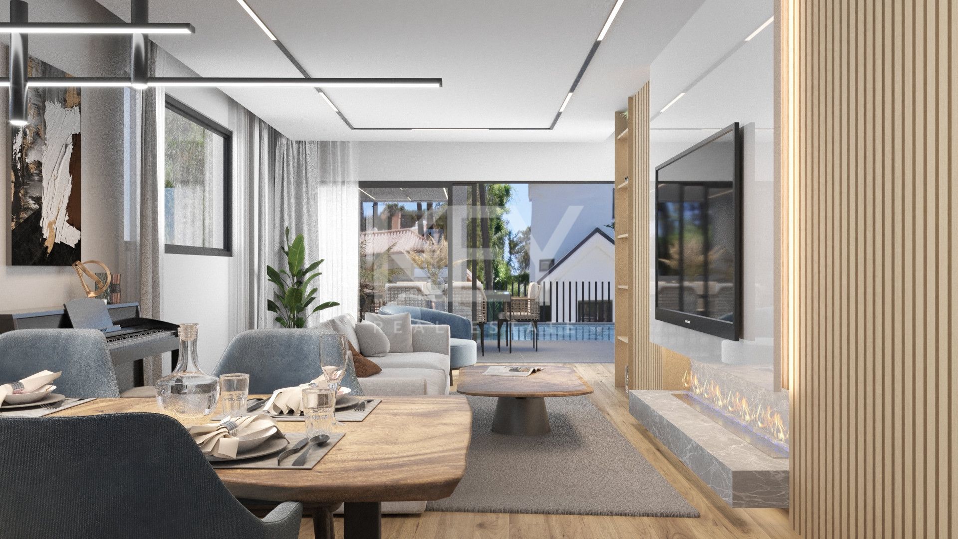 Интерьер виллы продолжает впечатлять качеством и продуманной планировкой. Главная спальня оснащена просторной гардеробной комнатой, обеспечивающей удобное хранение вещей. Открытая планировка объединяет гостиную, столовую и современную кухню, создавая светлое и комфортное пространство для повседневной жизни и приёма гостей. Камин добавляет уюта в прохладные вечера, а большие раздвижные стеклянные двери обеспечивают плавный переход между внутренними и внешними зонами и наполняют дом естественным светом.