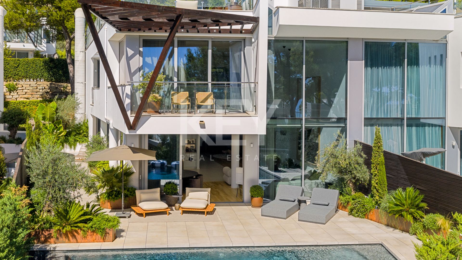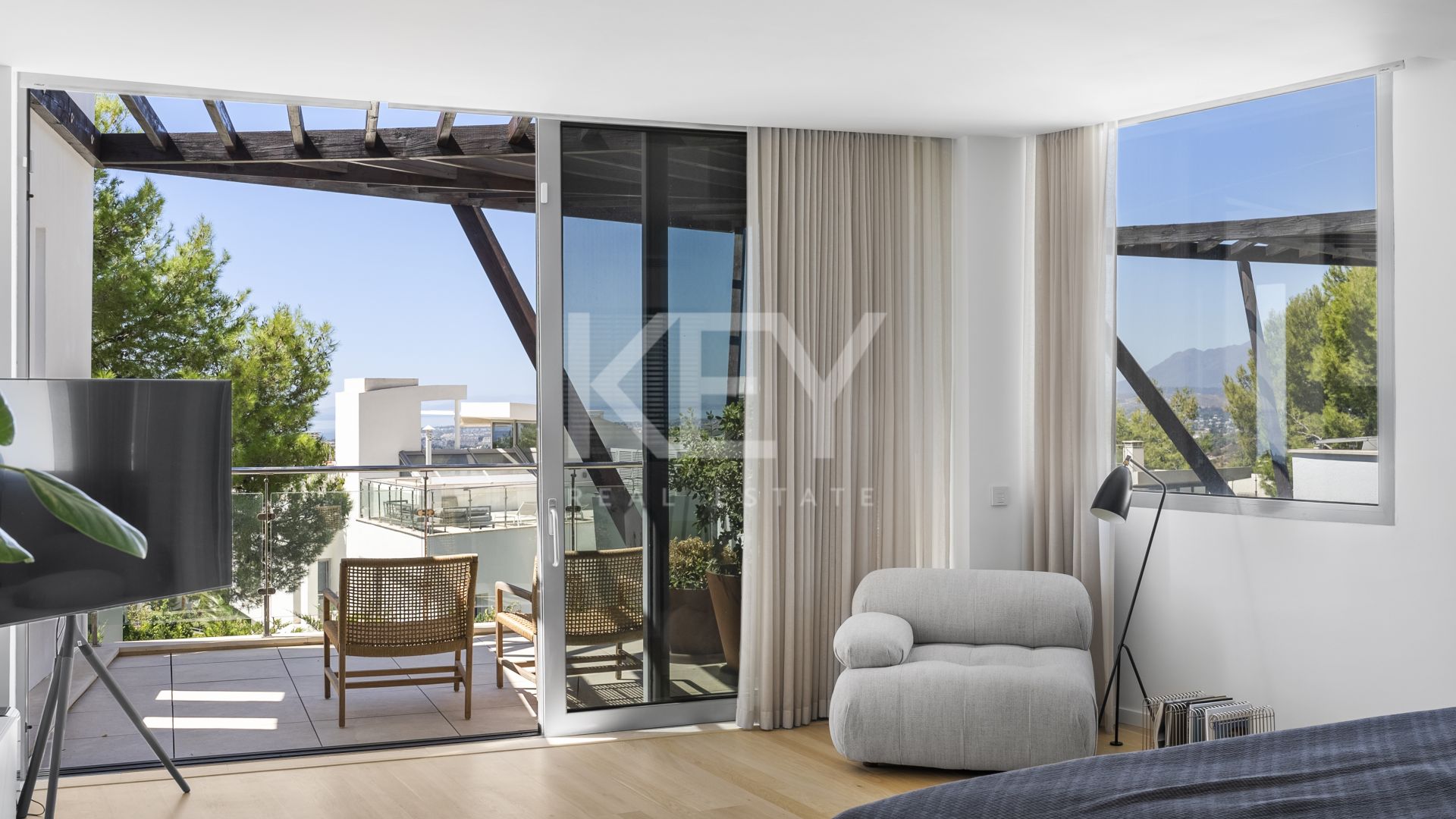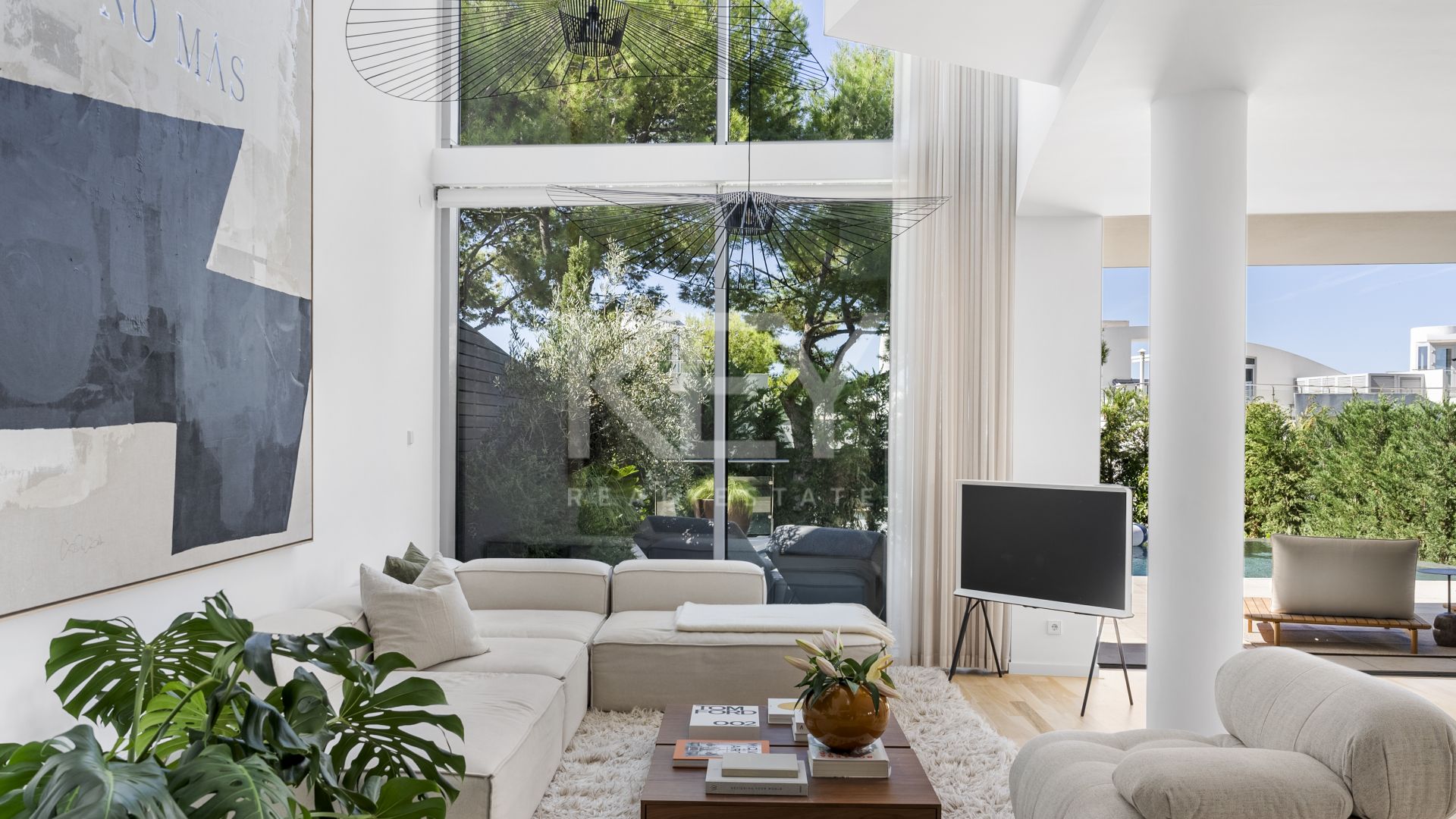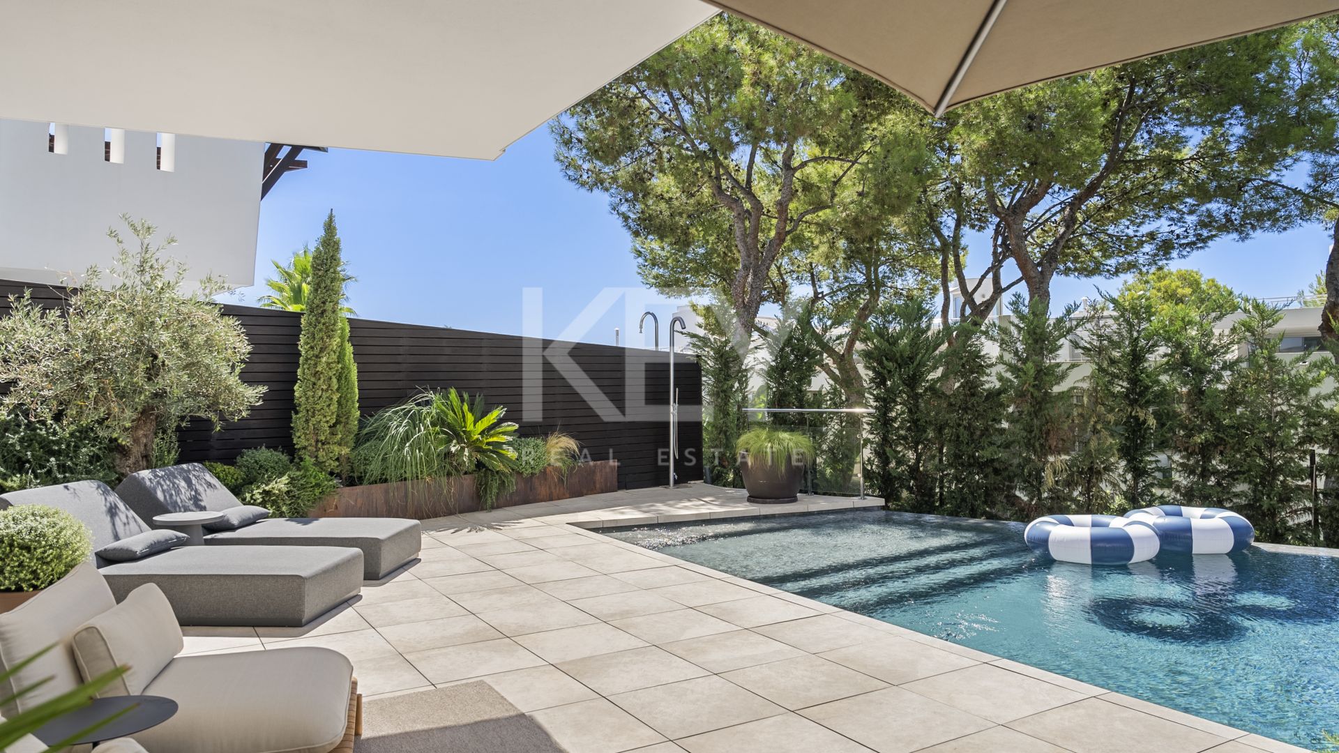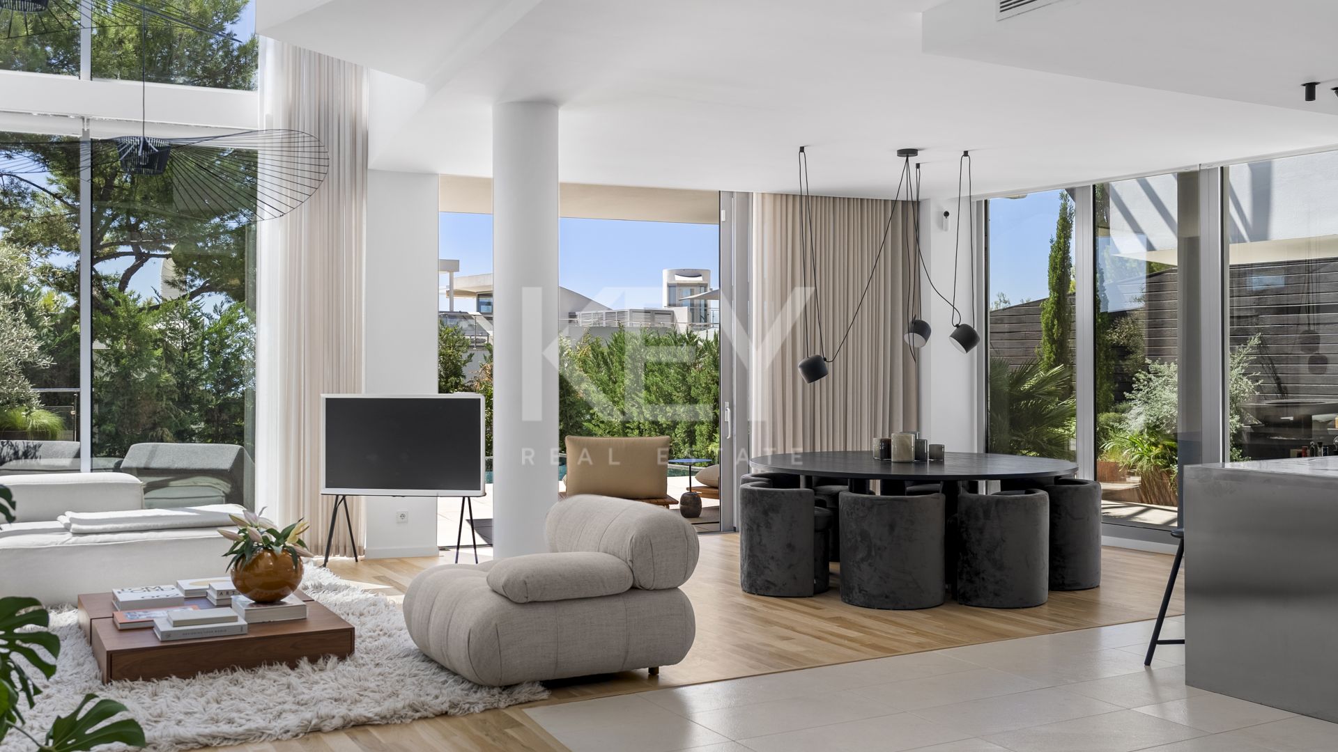 Таунхаус распределён на четырёх уровнях, соединённых частным лифтом, что обеспечивает удобство передвижения по дому. Основные жилые зоны расположены на двух этажах и включают просторные гостиные и столовые открытой планировки, наполненные естественным светом. Панорамные раздвижные двери ведут на южную террасу с частным бассейном, создавая гармоничное объединение внутреннего и внешнего пространства — ключевую особенность современной недвижимости высокого класса в Марбелье.