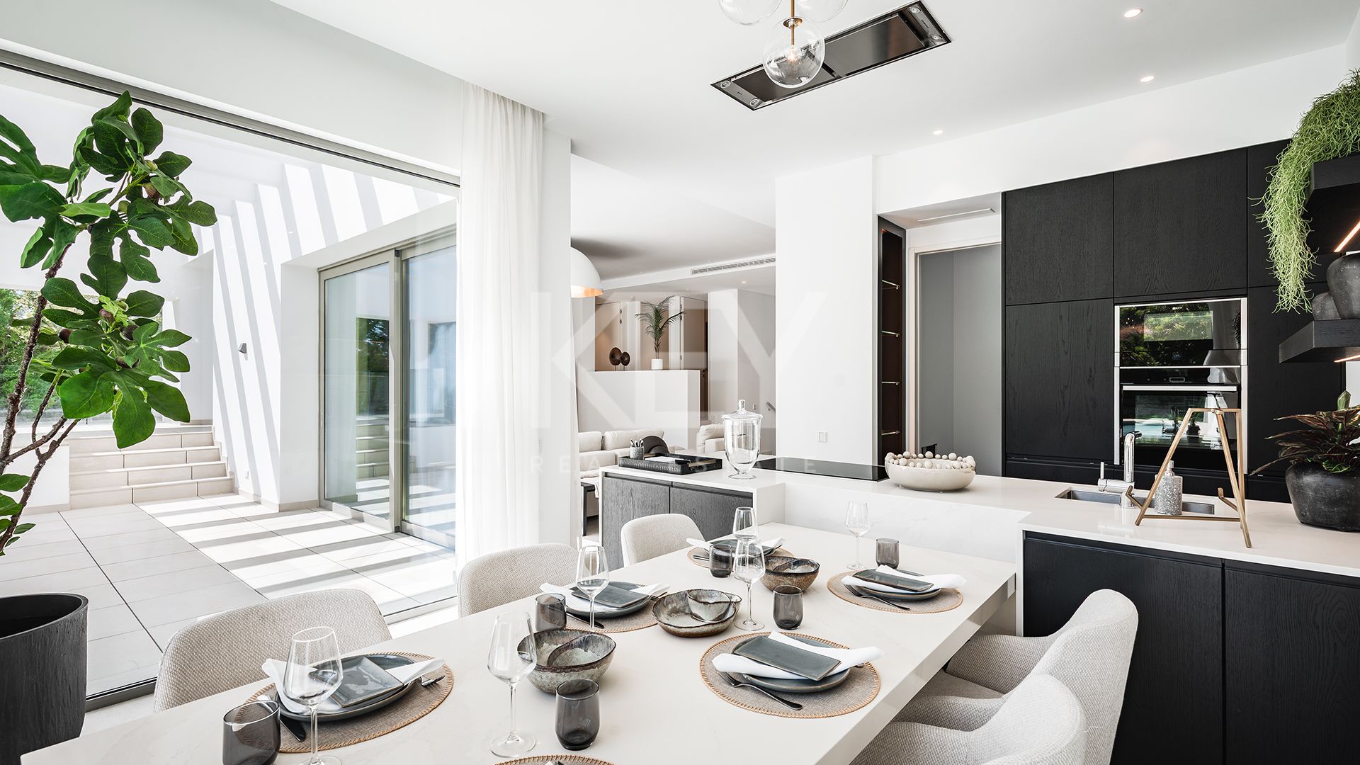 Вилла спроектирована таким образом, чтобы максимально использовать естественное освещение и создать комфортные жилые пространства, распределённые на трёх уровнях. На основном этаже находится просторная гостиная и столовая открытой планировки, соединённые с современной кухней, полностью оборудованной высококачественной немецкой техникой. Большие раздвижные стеклянные двери создают плавный переход между внутренними и внешними пространствами и ведут на просторные террасы с крытыми зонами отдыха и местом для обедов на свежем воздухе. Такое решение позволяет наслаждаться мягким климатом Марбельи круглый год и создаёт идеальную атмосферу для встреч с семьёй и друзьями.