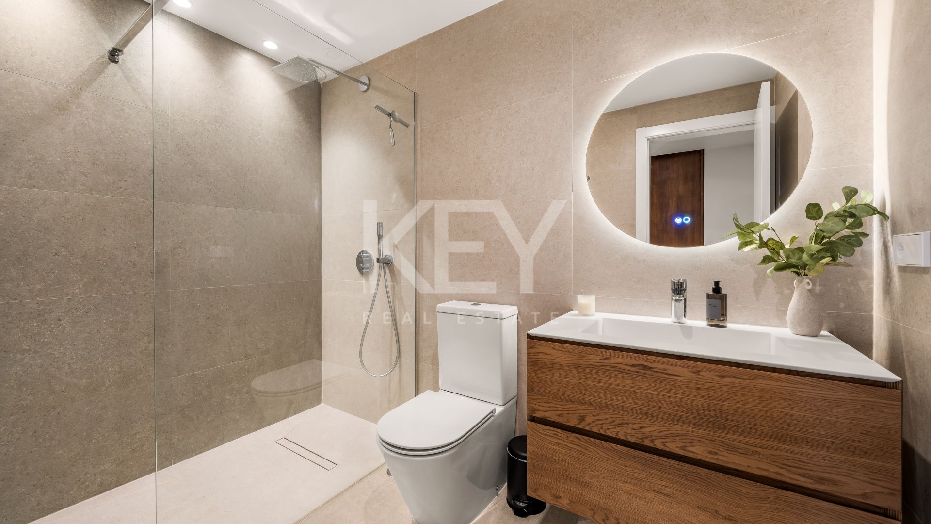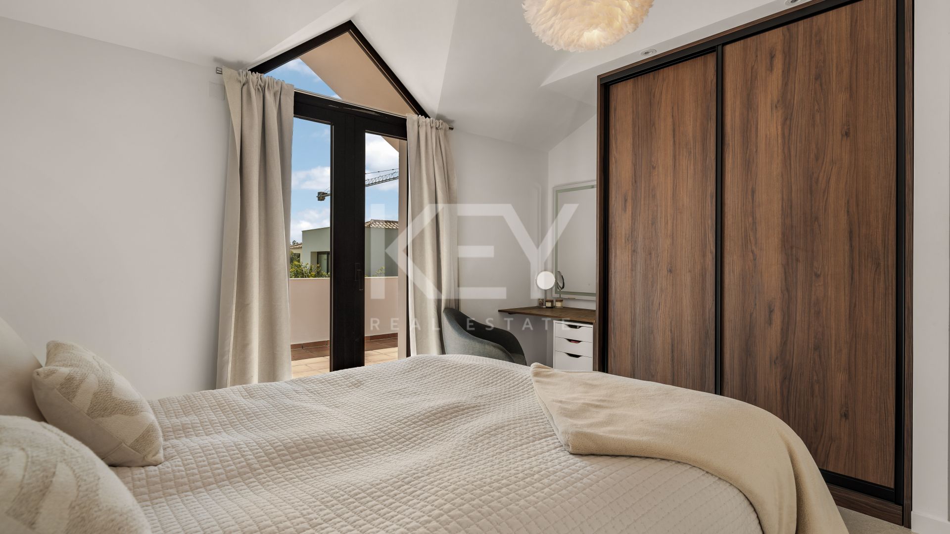На верхнем этаже расположены спальные комнаты. Главная спальня выделяется высокими потолками, встроенными шкафами, собственной ванной комнатой и прямым выходом на террасу. Вторая спальня, также с ванной комнатой, имеет отдельную террасу с ориентацией на юго-запад, что позволяет наслаждаться солнечными днями и видами на окружающий район.