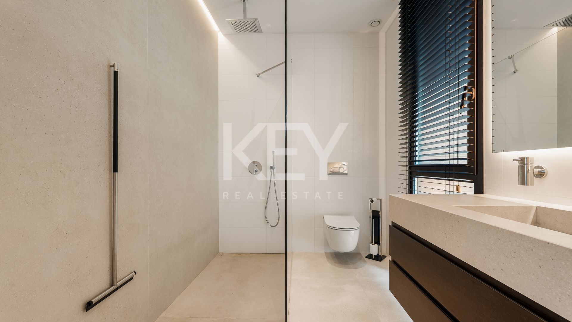 Вилла включает четыре спальни и пять ванных комнат, обеспечивая комфорт и уединение как для владельцев, так и для гостей. Дополнительно предусмотрены вторая гостиная, зона для занятий спортом, винный погреб, прачечная и помещения для хранения, а также возможность обустроить пятую спальню или кабинет. Нижний уровень визуально связан с подогреваемым бассейном, что придает объекту выразительную архитектурную особенность. Прямой выход в сад из жилых зон позволяет естественно объединить внутреннее и внешнее пространство.